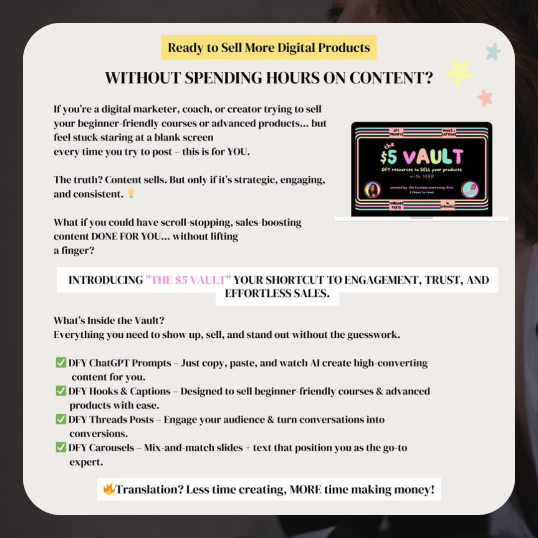 👉 Meet "The $5 Vault" – Your Shortcut to More Engagement, More Sales & Less Work.