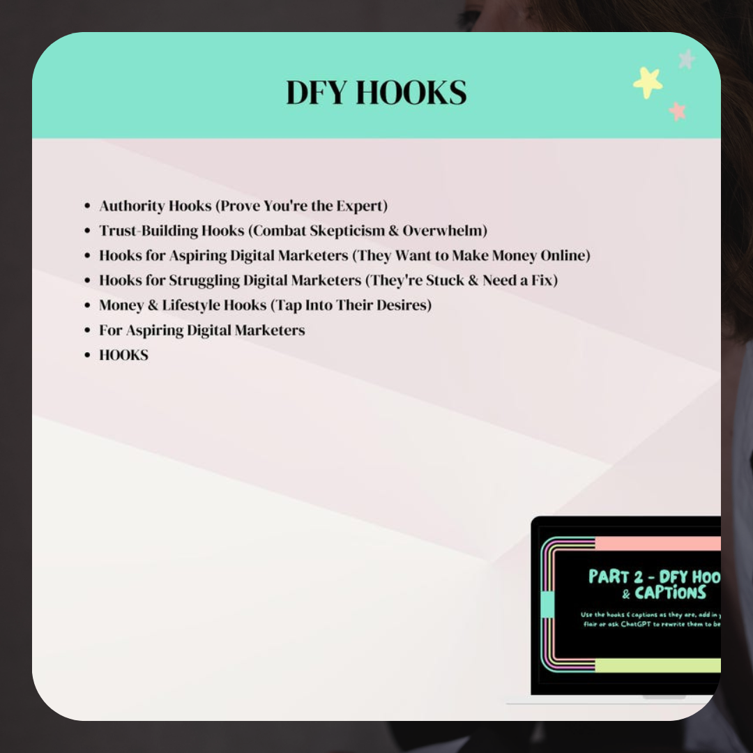 ✅ DFY Hooks & Captions – Crafted to sell beginner-friendly courses & advanced digital products.
